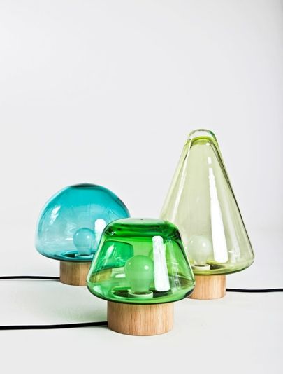 Série de lampes en verre soufflé et bois tourné, 3 modèles « Skog » (signifie « forêt » en norvégien) h45, 31 et 25,5 cm