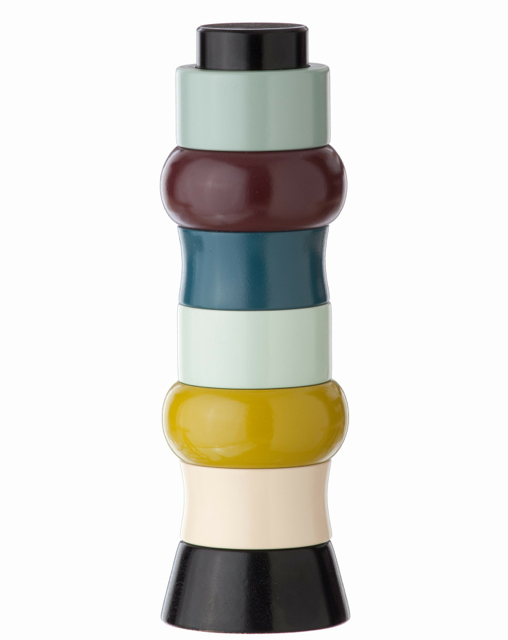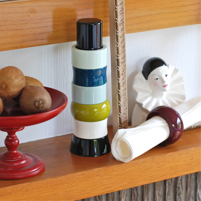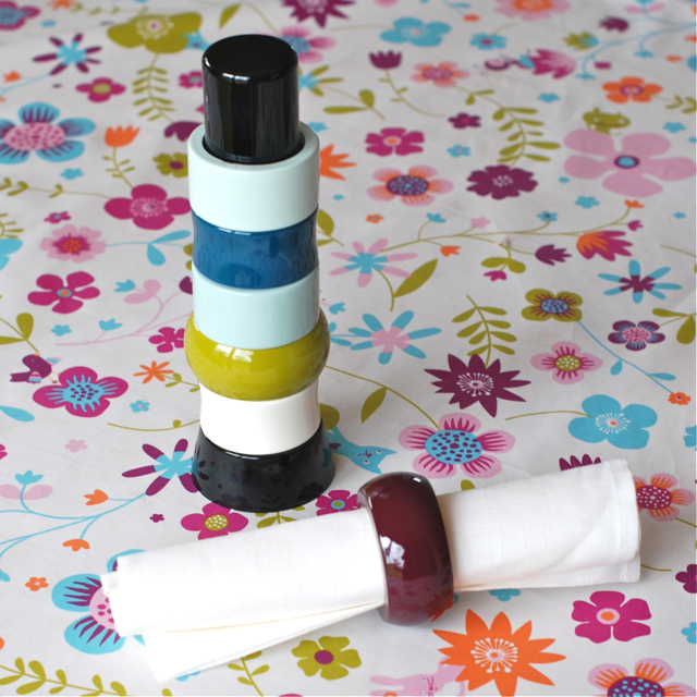 Cette tour colorée est en fait 6 ronds de serviette en bois laqué par la marque danoise Ferm Living.
