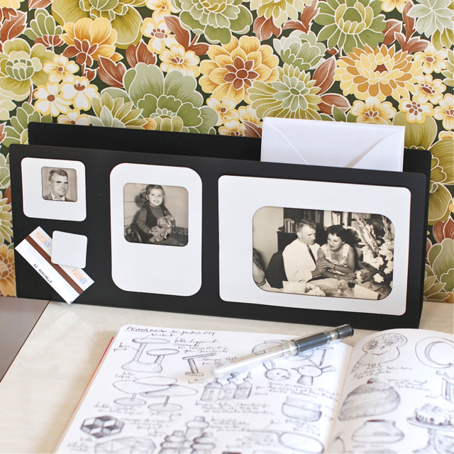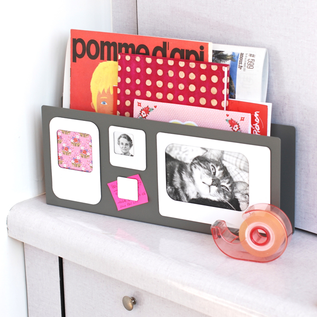 Profitez de vos photos préférées tout en rangeant votre bureau avec ce porte-courier en tôle laquée et cadres en caoutchouc magnétique, design Presse-citron.