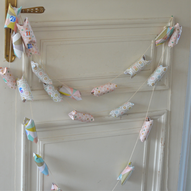 Nous sommes fin novembre et comme chaque année c’est au dernier moment que j’arrive à finaliser le calendrier de l’avent fait maison! J’aime le faire moi-même mais le temps finit toujours par manquer surtout cette année où tout semble s’accélèrer ! C’est donc sur la dernière ligne droite de novembre que je vous montre mon calendrier DIY … il vous suffit de 24 rouleaux de papier toilette (patiemment récoltés ces dernières semaines ! ), de jolis papiers (j’ai utilisé les sets de table signés Mini labo) de quelques petits trésors et chocolats divers et variés, de colle, de ciseaux et d’un peu de laine si vous choisissez l’option à accrocher !